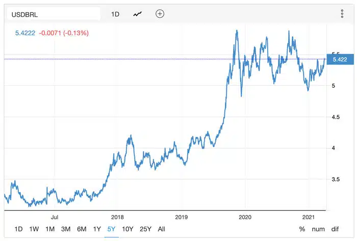 Meanwhile, the Brazilian currency, the real, has depreciated significantly against the US dollar since 2018 (see chart below). It has however stabilised over the past year and is largely expected to hold its current value over the next 12 months.