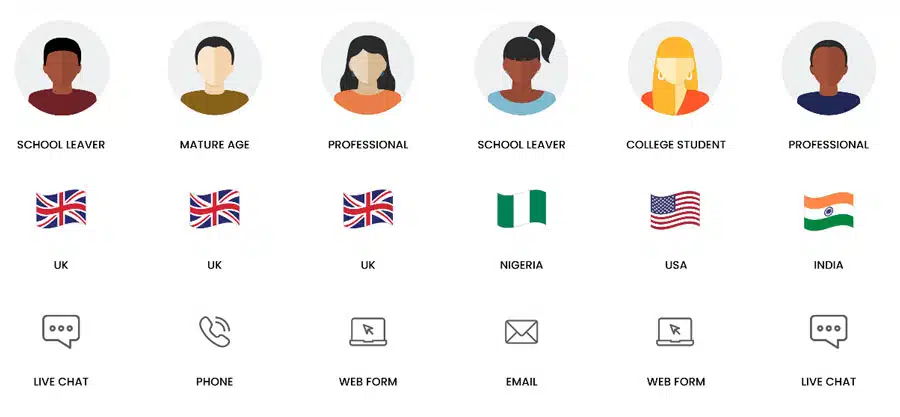 The enquiries were placed for six carefully defined student personas, including three prospective international students (as illustrated below), and across four enquiry channels: live chat, phone, web form, and email. Speaking during a recent webinar that presented the research findings, UniQuest Chair & Co-founder Natalie Letcher set the context for the study by noting that, "A great enquiry experience supports conversion."
