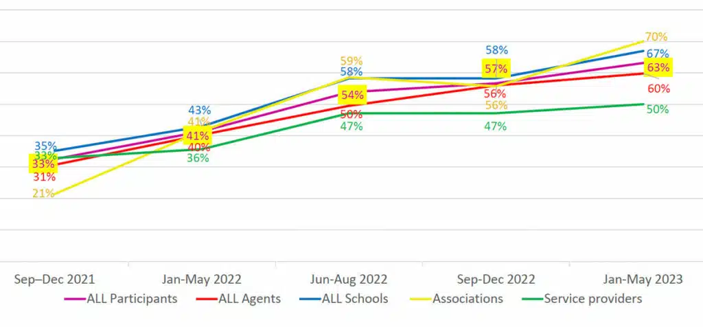 - A newly released survey of agents and schools finds a modest increase in optimism for recovery in the near-term but a more conservative outlook for business volumes through the first half of 2023
