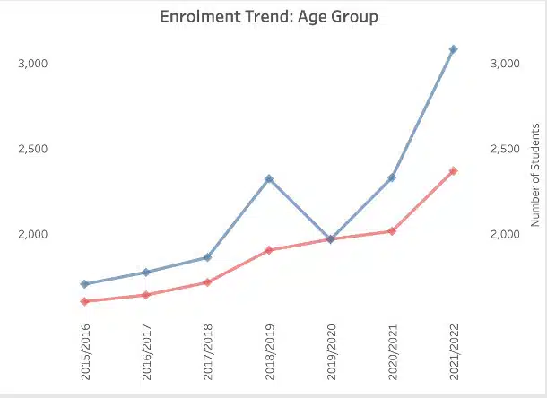 The next chart depicts non-EU enrolments from countries other than the UK. In this case, 2021/22 enrolments from non-EU students 23 and under are down slightly (-5.7%) from 2019/20, while the older cohort (again, represented by the red line) grew by 11.9% in that two-year timeframe.