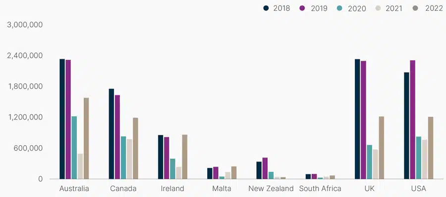 ELP student weeks by destination, 2018–2022. Source: EnglishUSA/BONARD