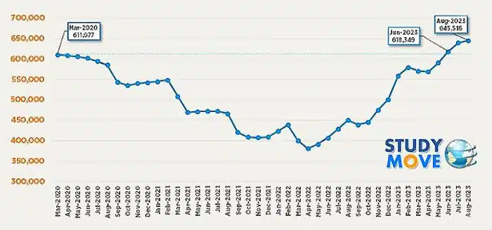 The top-line finding here is that the number of foreign students holding Australian student visas now exceeds the pre-COVID threshold. The following chart indicates that the total number of visa holders reached 645,516 as of August 2023 – roughly 6% higher than the March 2020 total of 611,077.