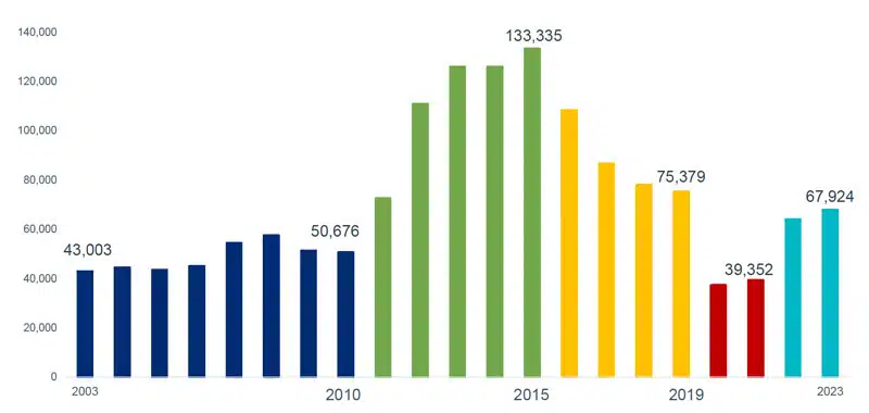 The latest data from IIE's annual survey of IEPs was released at NAFSA last week. The 700+ responding centres reported a combined enrolment of 67,924 students for 2023, representing a 6% year-over-year increase, and a total of 757,712 student-weeks (+13% compared to 20222).