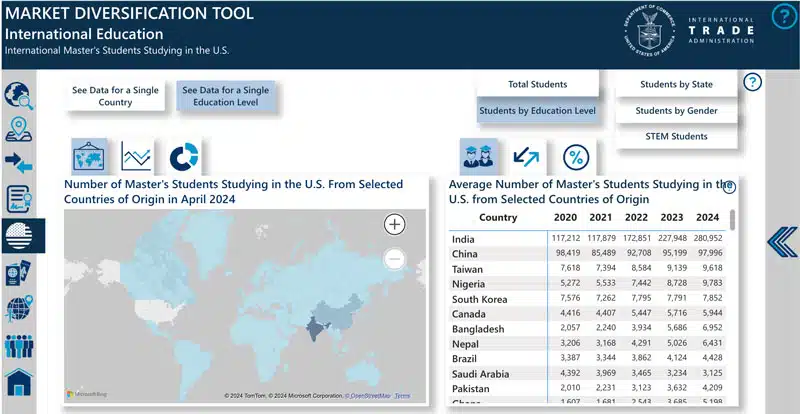 Given the need for new and better ways to collect and interpret data on international student movement, we can expect to see a variety of new tools and data dashboards in the years ahead. The latest entry in this category comes from the International Trade Administration (ITA) in the United States, which showcased a new Market Diversification Tool for International Education at the annual NAFSA conference in New Orleans last week.