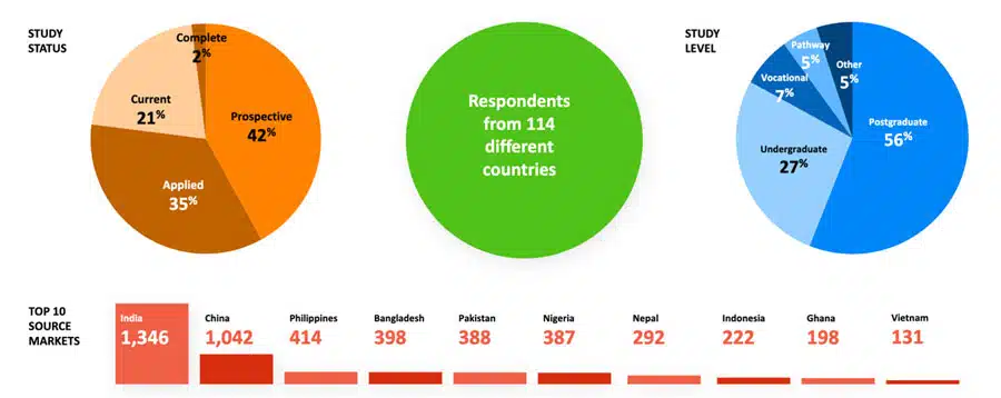 As the following chart shows, most surveyed students were prospective or had applied to at least one institution. More than half were at the postgraduate level, with 27% at the undergraduate level. India and China were the two most-represented markets, with the Philippines, Bangladesh, Pakistan, Nigeria, Nepal, Indonesia, Ghana, and Vietnam rounding out the top 10 nationalities by response volume