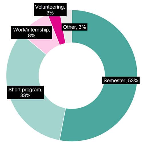 As we see in the following chart, more than half of the pilot cohort participated in a semester abroad, with another third attending a short international programme. The remaining 14% participated in a varsity of work placements, internships, or volunteer assignments.