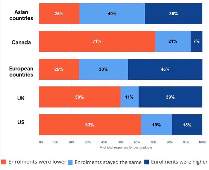 Of the Canadian university respondents surveyed, 82% said their undergraduate enrolments are lower than last year, and 71% said the same about postgraduate enrolments. Nearly half (48%) of their US counterparts saw fewer undergraduate enrolments in the fall 2025 intake, and 63% said the same for postgraduate students.