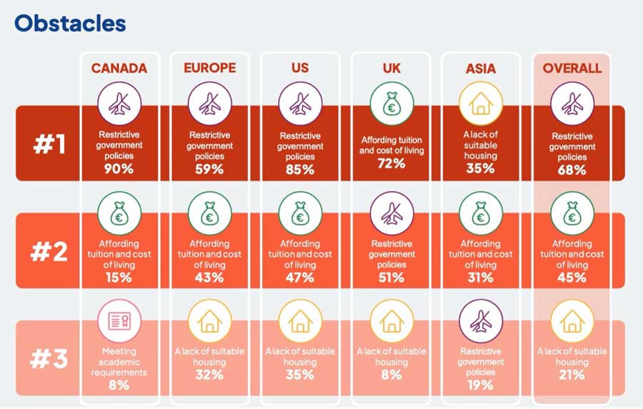 Overall, a majority of institutions reported having more issues with visa restrictions and government policies: 68% vs. 51% in 2024. This is a big leap, and it is being driven by the responses of university respondents in North America. In the US, fully 85% of institutional respondents said visa barriers are now a major concern (up from 58% in 2024). Visa and immigration issues rose even further in Canada (90%).