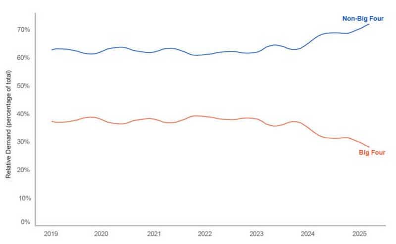 As government policies continue to challenge North American and UK institutions, international students are demonstrably switching their focus to alternative destinations. In the last Global Benchmark Report, which centred on the January-March 2025 intake, Studyportals produced this graph that shows student search volumes for bachelor’s and master’s programmes on Studyportals websites over the six months leading to that study.