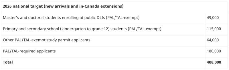 The following chart from IRCC breaks down the 2026 target into key student categories, both those exempted from the enrolment cap (masters, doctoral, and K-12 students) and those that require a provincial or territorial attestation letter (PAL/TAL) in order to apply for a study permit under the enrolment cap.