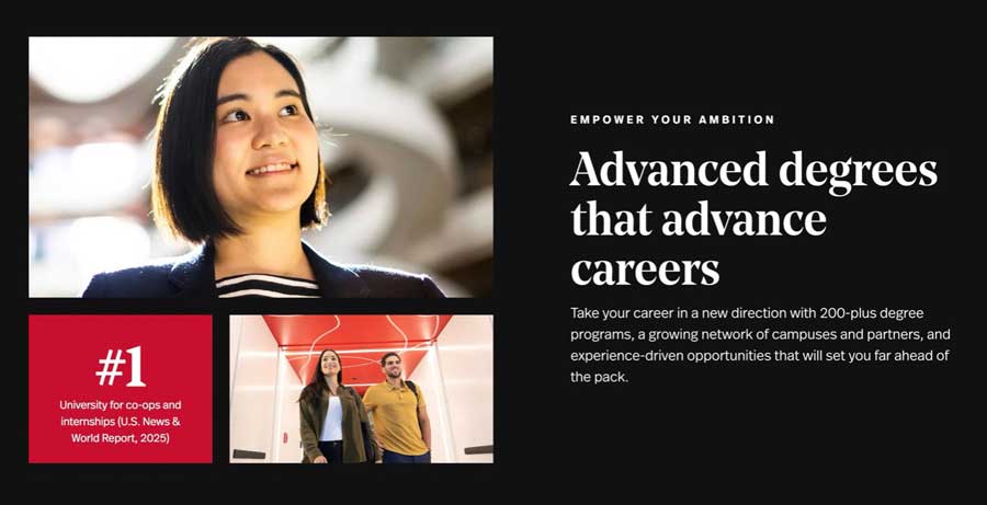Northeastern University (US) is a pioneer of integrating workplace learning into academics. It is famous for its six-month co-op opportunities – mostly paid, and the university strongly encourages employers to compensate students – at the undergraduate and master’s levels. For example, business and law students can work with legal firms or multinationals including Deloitte and Microsoft to gain hands-on expertise. In fact, if you look at Northeastern’s homepage, you’ll see that “Experience” leads the branding in the university’s carousel-styled banner, followed by “Research” and “Global.”