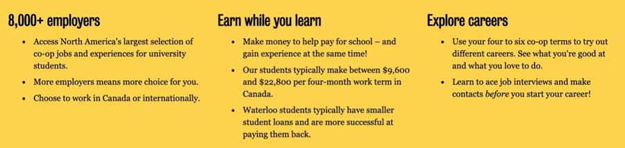 Open to Canadian and international students, Waterloo's co-op program is an amazing way to learn to successfully interview for jobs, test drive up to six careers, graduate with up to two years of valuable experience – and make money!”