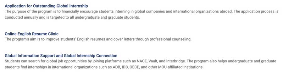 Check out Korea-based Seoul National University’s Career & Work page and you’ll need to scroll to see all the career supports the university provides. From courses to internships to job fairs and career “concerts,” the list is extremely impressive. There are even options specifically for international students and one focused on jobs in the global economy, complete with English-language coaching for resumes, interviews, and presentations.