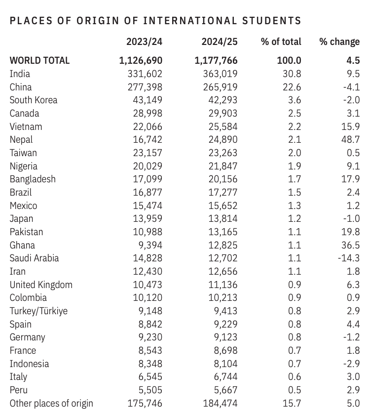 Leading countries of origin for foreign students at US higher education institutions in 2024/25. Source: IIE’s 2025 Open Doors Report