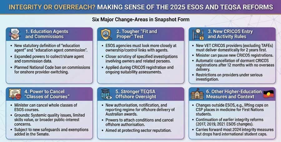 - The Australian government has passed a package of legislative amendments that includes new provisions for the Education Services for Overseas Students Act 2000 (ESOS Act) and the Tertiary Education Quality and Standards Agency Act 2011 (TEQSA Act)