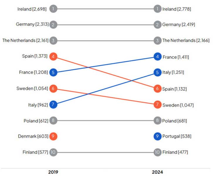 As you can see in the chart below, France and Italy were the only ones in the top 10 list of European countries supplying English-taught programmes (ETPs) on campus to have risen significantly since 2019. France expanded by +16.8% to 1,410 in 2024, while Italy nearly doubled that rate of growth (+30% to 1,250 in 2024). This is in contrast to Spain, Sweden, Denmark, and Finland, which have reduced their ETP supply.