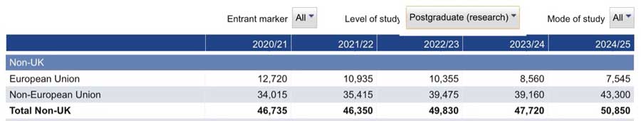 In a November 2025 survey conducted by the British Universities International Liaison Association (BUILA), 42 of 69 responding universities (61%) reported a decrease in postgraduate commencements for the academic year beginning September 2025.