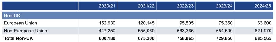 In total, UK universities enrolled 685,565 international students, the vast majority of whom came from outside the EU (621,970). A smaller proportion came from the EU (63,500, down -15.7% from the previous year).