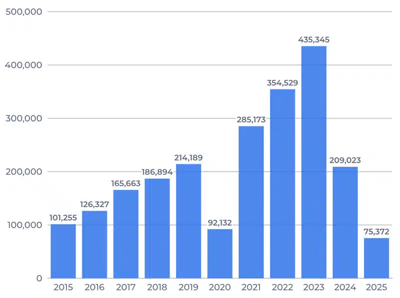 Canada approved only 75,372 new study permits in 2025. This represents a -64% drop year-over-year, and an -18% decline from the previous low in 2020 at the peak of the COVID-19 pandemic.